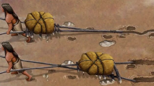 These, too, are tracks, but not the kind left by feet. Instead, they belong to travois, the earliest form of terrestrial transportation currently known. Made with long sticks and a basket or net, these primeval vehicles look a bit like a wheelbarrow without the wheel: Pulling the lifted handle or handles moved the basket attached to the sticks, allowing a person to glide heavy cargo across the sand.