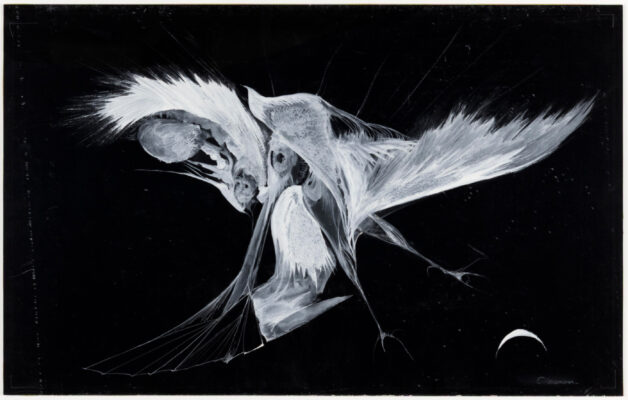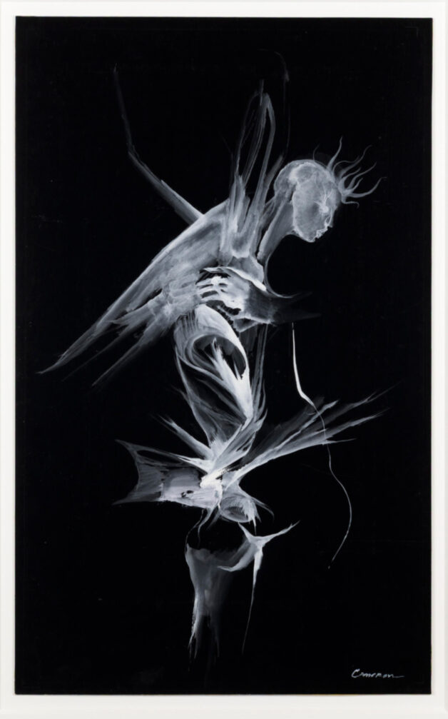 After serving in the U.S. Navy as a cartographer, Cameron became a central figure in both the Los Angeles art scene and the world of occultism. She starred in Kenneth Anger’s Inauguration of the Pleasure Dome (1954) and collaborated with the artists and poets she mentored, including Wallace Berman and George Herms. This exhibition showcases the breadth of Cameron’s output, from spellbinding abstract drawings to high-contrast graphic figures. Cameron blurs the lines between the mystical and artistic, drawing viewers into a world where dreamlike scenes and esoteric themes reign supreme.”